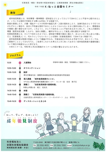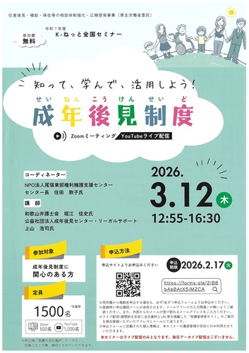 令和7年度 K-ねっと全国セミナー「知って、学んで、活用しよう!成年後見制度」が、オンラインで開催されます。